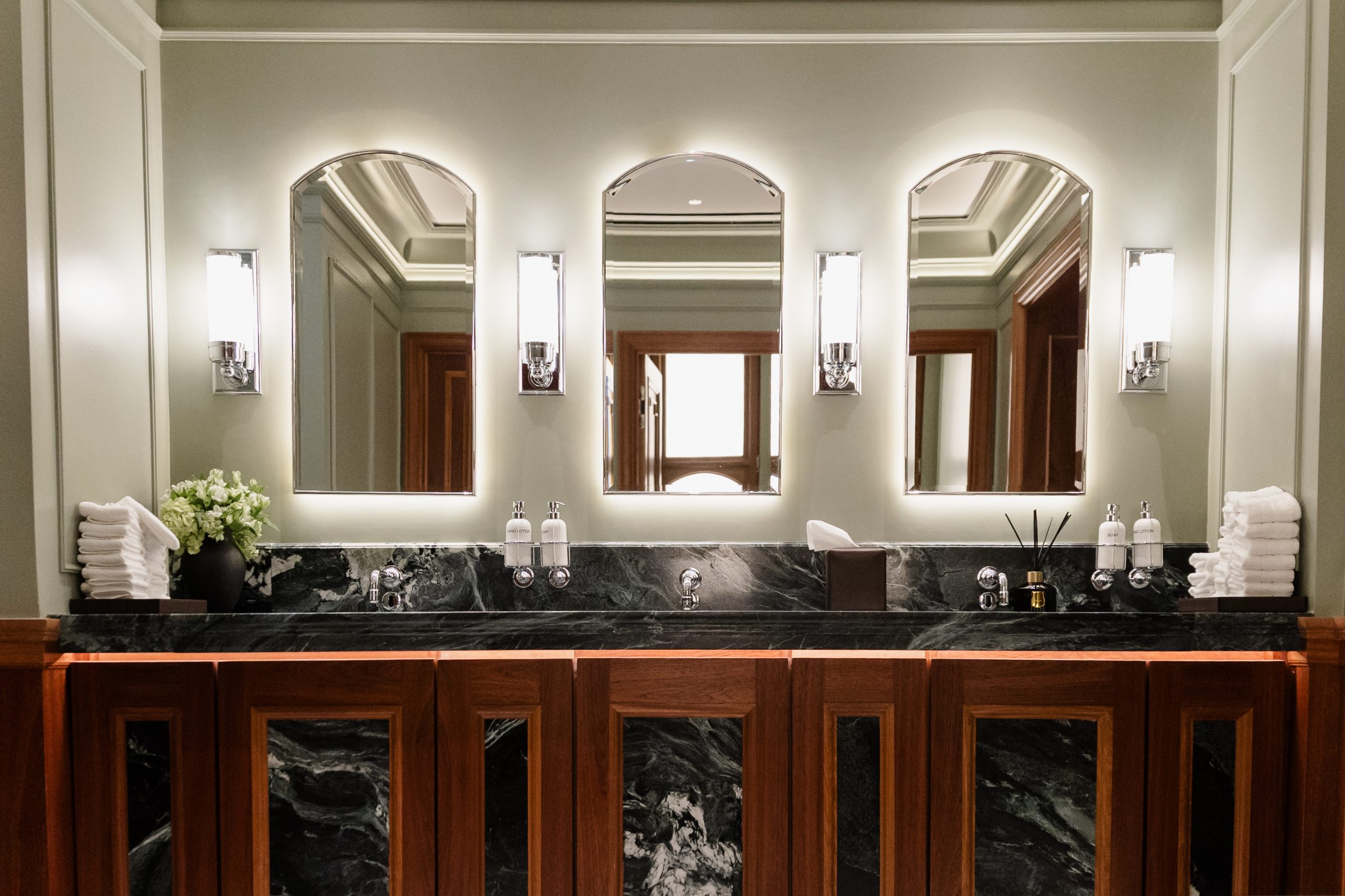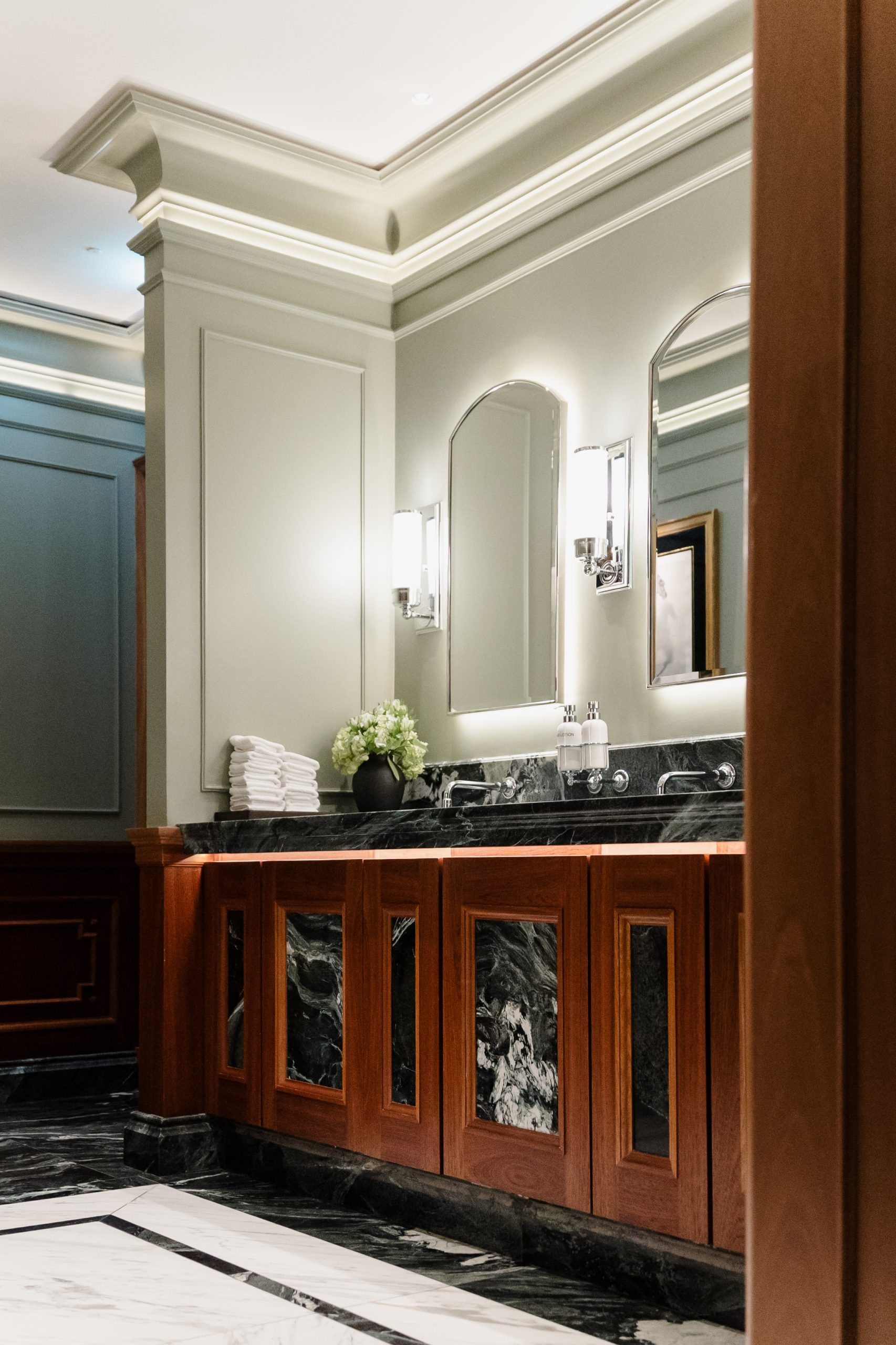The contrast between the male and female restrooms was intentional — each space tailored to evoke a unique atmosphere while maintaining the Connaught’s signature elegance.