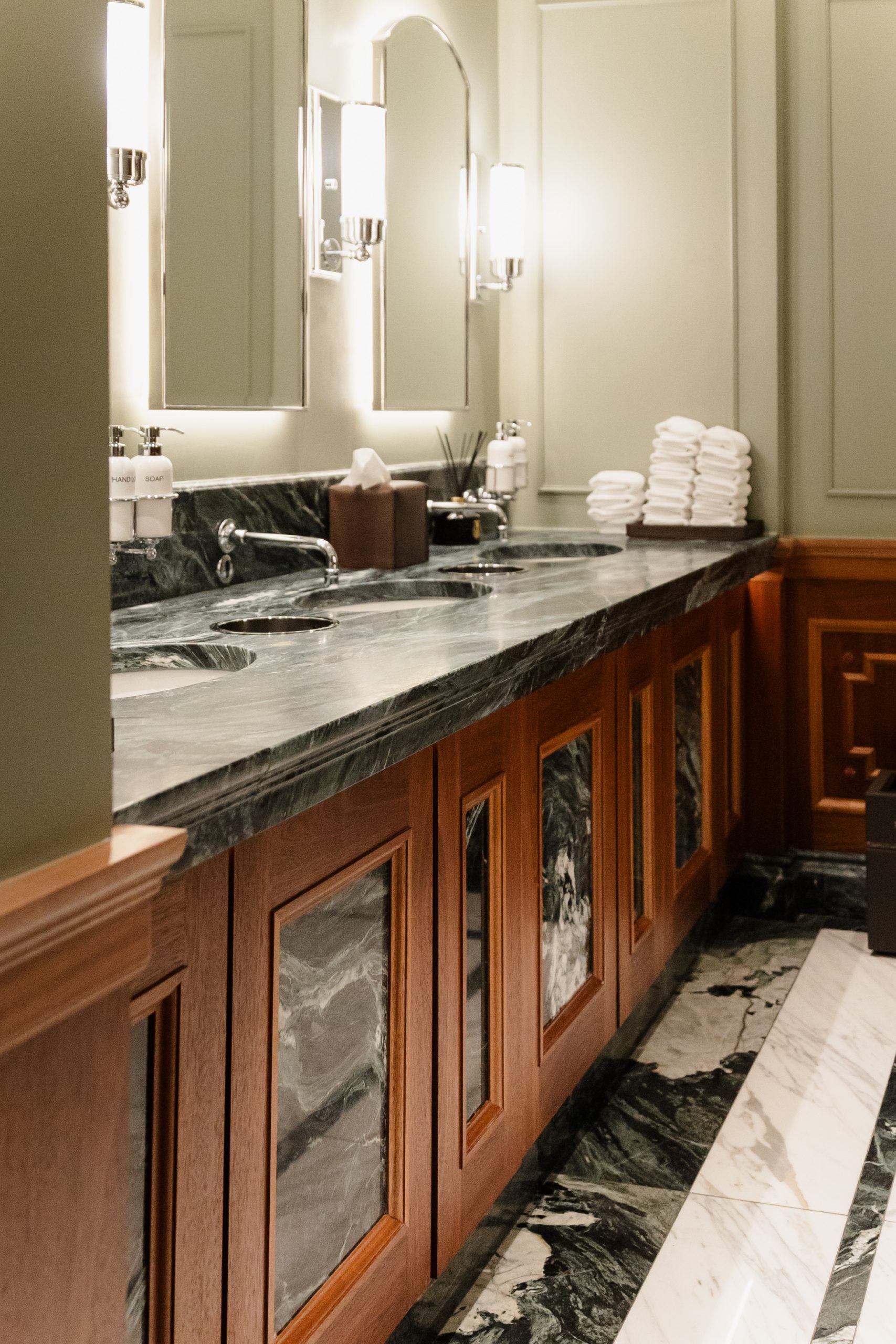 This project was designed to reflect the elegance and strength of traditional British interiors, with a darker, moodier palette that sets it apart from the lighter, more delicate tones of the female restrooms.